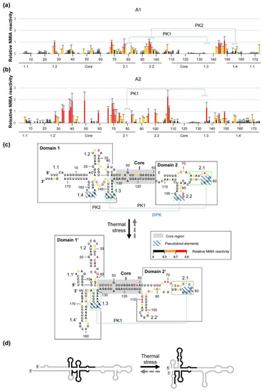 In conformation A2, domain 1 modifies its folding towards a more flexible structure, as deduced from the reactivity profile (Figure 7), to generate the so-called domain 1′. It folds into four well-defined stem-loops that determine three different subdomains to those predicted for the A1 isoform, named 1.1′, 1.2′, and 1.4′, and the preserved subdomain 1.3 (Figure 7). From a structural point of view, domain 2′ roughly resembles the predicted domain 2 for the A1 isoform, composed of two stem-loops showing a certain degree of flexibility, as deduced from the reactivity pattern. Domain 2′ also conserves the structural organisation for subdomain 2.1 with respect to isoform A1 (Figure 7). However, a slight sequence slippage induces the extension of the subdomain 2.2′, exposing different nucleotides at the apical loop. The main consequence of this structural tuning is the abolishment of PK2, maintaining the single pseudoknot, PK1, which connects subdomains 2.1 and 1.3 around the core region (Figure 7). This observation makes it appealing to propose that PK2 could be related to a putative thermometer-associated function of CriTER-A, while PK1 could be essential for the maintenance of the structural equilibrium between both isoforms A1 and A2.