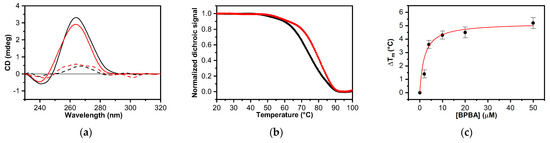 (a) CD spectra of TERRA G4 in the absence (black line) and presence (red line) of 10 molar equiv of BPBA recorded at 20 and 100 °C (solid and dashed lines, respectively); (b) CD melting profiles of TERRA G4 in the absence and presence (black and red dots, respectively) of 10 molar equiv of BPBA recorded at 1 °C/min heating rate; (c) CD stabilization curve for TERRA G4 with BPBA.