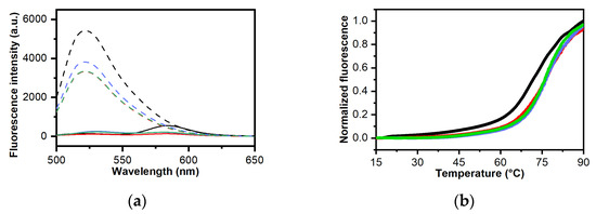 (a) Fluorescence emission spectra recorded at 15 °C (solid lines) and 90 °C (dashed lines); (b) FRET melting experiments for F-TERRA-T (0.2 μM) in the absence (black) and presence (red) of BPBA (2.0 μM). Experiments in the presence of BPBA were also performed by adding a large excess of Hrp27 duplex competitor (6.0 μM, blue; and 20.0 µM, green).