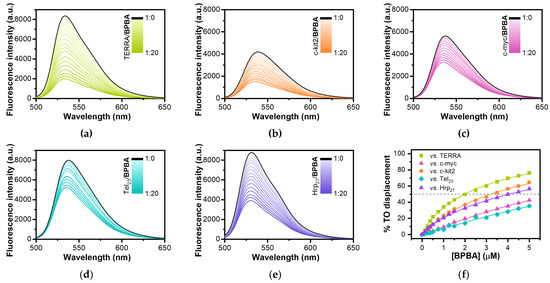 TO displacement titrations for (a) TERRA G4, (b) c-kit2 G4, (c) c-myc G4, (d) Tel23 G4, and (e) Hrp27 upon addition of increasing amounts of BPBA; (f) Dose–response curves from FID experiments.