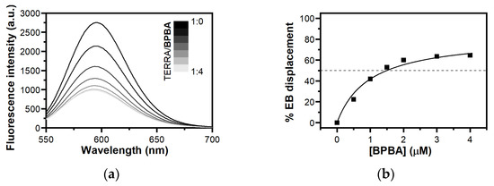To obtain information on the binding mode of BPBA to TERRA G4, an ethidium bromide (EB) displacement assay was performed using fluorescence spectroscopy. EB binds to duplex DNA through intercalation, and to G4 DNA through π–π stacking on the external G-tetrads [76]. In the absence of DNA, EB emits weak fluorescence at 595 nm, while its fluorescence is strongly enhanced upon association with G4s as a consequence of the hydrophobic environment experienced by EB upon binding to the nucleic acid [77]. Therefore, the addition of a G4 ligand decreases EB fluorescence intensity if it binds to G4 via end-stacking mode. Displacement titrations performed by adding increasing amounts of BPBA to the TERRA G4/EB complex showed a substantial decrease in the fluorescence intensity of EB (Figure 5), thus suggesting an end-stacking binding mode for this ligand to TERRA G4 [78,79]. In addition, the concentration of BPBA required to give the 50% decrease in EB fluorescence (DC50 value) was calculated from dose–response curves obtained by plotting the percentage of EB displacement against ligand concentration. A DC50 value of 1.3 (±0.4) µM was determined, confirming once again the strong interaction between BPBA and this G4 motif.