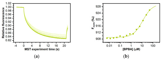 MST measurements on the interaction of compound BPBA with TERRA G4. (a) Time traces recorded by incubating increasing concentrations of BPBA with the labeled G4; (b) the corresponding binding curves.