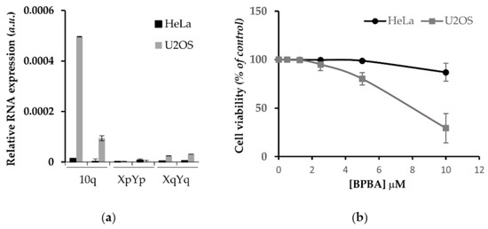 G4 binders have an established antiproliferative effect in cancer cells depending on their ability to induce DNA damage response (DDR) or to inhibit the expression of cellular oncogenes. Since BPBA showed a high affinity to TERRA G4, we assessed the antiproliferative effect of this compound in correlation with TERRA expression. To this aim, we employed human cervix cancer cells (HeLa) characterized by telomerase activity and low TERRA expression, as well as human osteosarcoma cells (U2OS) lacking telomerase activity and expressing high levels of TERRA [83,84]. In those cell lines, TERRA expression was measured by RT qPCR assay with primers against some of the most active TERRA promoters located at subtelomeres of chromosomes 10q, XqYq, and XpYp, showing a huge difference of expression between the two cell lines (Figure 7a). Then, the viability of cells exposed to BPBA concentration ranging from 50 nM to 10 µM was assessed by crystal violet assay. As shown in Figure 7b, U2OS cells were significantly more sensitive to BPBA (IC50 = 8.1 (±1.0) µM) with respect to HeLa (IC50 >> 10 µM).