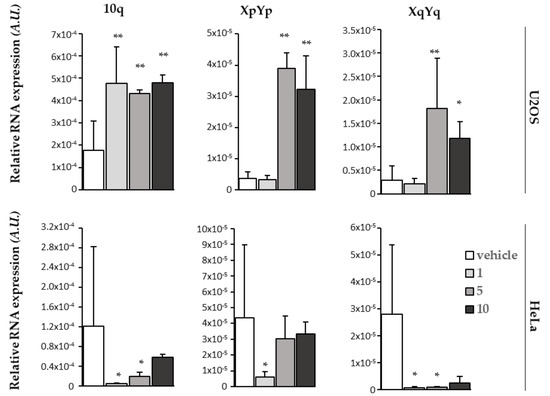 Effect of BPBA on TERRA expression. RT qPCR showing relative expression of specific TERRA RNA at different subtelomeric loci of HeLa and U2OS cells treated with the vehicle or indicated doses (1, 5, or 10 µM) of BPBA for 72 h. Mean of three independent experiments is shown. Error bars are SD; * = p < 0.5; ** = p < 0.1.