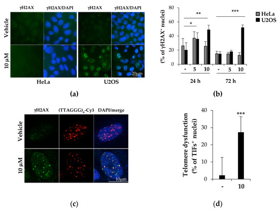 TERRA displacement from telomeres is supposed to induce telomere dysfunction [85]. To better understand the mechanisms underlying the cytotoxicity of BPBA in U2OS cells, we investigated the possibility that TERRA stabilization by BPBA could induce a DDR at telomeres (a marker for telomere dysfunction) leading to cell death. To this aim, both U2OS and HeLa cells were exposed to the compound for 24 or 72 h, and DDR activation was measured as the percentage of cells displaying γH2AX histone phosphorylation, a marker of DDR. As shown in Figure 9, HeLa treated with 5 or 10 µM BPBA showed a negligible DDR induction both in the first 24 h of treatment and in the following 72 h. Conversely, compared to the control, both 5 and 10 µM BPBA were able to induce DDR in a significant fraction of U2OS cells in the first 24 h (Figure 9b). However, while the 5 µM dose-induced DDR was rescued in the following 72 h, DDR was persistent at 72 h in 50% of the U2OS cells treated with 10 µM BPBA, in agreement with the calculated IC50 dose (Figure 7b). Lastly, to ascertain if the activated DDR coincided with telomeric loci, telomere-dysfunction-induced foci (TIF) activation was measured in U2OS cells treated with 10 µM BPBA for 72 h (Figure 9c). TIF positive cells (defined as cells displaying at least 4 of Cy3-conjugated telomere PNA probe/phosphorylated γH2AX histone colocalizing spots) were significantly increased in treated samples compared to in the control (Figure 9d).