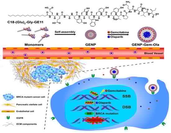 - Du, C.; Qi, Y.; Zhang, Y.; Wang, Y.; Zhao, X.; Min, H.; Han, X.; Lang, J.; Qin, H.; Shi, Q. Epidermal growth factor receptor-targeting peptide nanoparticles simultaneously deliver gemcitabine and olaparib to treat pancreatic cancer with breast cancer 2 (BRCA2) mutation. ACS Nano 2018, 12, 10785–10796. [Google Scholar] [CrossRef]