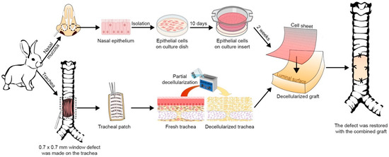 In this study, we generated autologous nasal epithelial cell sheets using our novel cell sheet engineering and then incorporated the cell sheets into transplanted decellularized tracheal scaffolds created by our previous partial decellularization protocol. To our knowledge, this is the first study that has directly applied the cell sheets onto the luminal surface of decellularized tracheal grafts, without any need for a revascularization period, to prevent stenosis formation after transplantation (Figure 1).