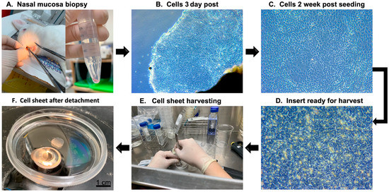 Flow diagram of the fabrication of the transplantable nasal epithelial cell sheets. (A): Nasal mucosa was harvested from the nasal cavity; (B): epithelial cells started to grow and move outside from the explanted tissue after 3 days of culture (magnification ×40); (C): nasal epithelial cells after 2 weeks of culture (magnification ×100); (D): cell sheet was ready for harvest after 10 days of seeding on culture insert (magnification ×200); (E): the cell sheet was detached from the insert membrane; (F): the harvested cell sheet had an intact and transplantable appearance.