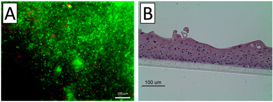 The harvested cell sheet had an intact and transplantable appearance. The viability and functionality of the harvested cell sheet were evaluated immediately after detachment by live–dead staining. The results showed that cell survival was not significantly compromised. Under histological analysis, HE-stained specimens showed that fabricated cell sheets consisted of multilayered mucosal epithelial cells with a round-shaped appearance (Figure 3).