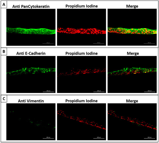 Immunohistochemistry fluorescent staining results of the cell sheets. The cell sheet was stained with each of the following antibodies: (A) anti-pan cytokeratin, (B) anti-E-cadherin, and (C) anti-vimentin. To aid in visualization and facilitating interpretation, all samples were counterstained with propidium iodide, which was used to stain the nucleus. The merged images showed that the nasal epithelial cell sheets expressed highly positive staining to anti-cytokeratin and anti-E-Cadherin antibodies while there was very little expression of anti-vimentin antibodies.