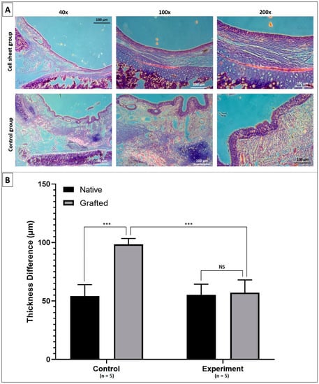 The thickness of the mucosal layer of the transplanted graft in each image was measured by using ImageJ software (National Institute of Health, New York, NY, USA). Statistical analysis was carried out using Prism 5 (GraphPad, La Jolla, CA, USA). Differences in the thickness of the mucosal layer of the grafted patch with and without cell sheet application were analyzed. Data were expressed as mean ± standard deviation (SD). For the t-test, statistical significance was defined as p < 0.05 (*), p < 0.001 (**), and p < 0.0001(***).