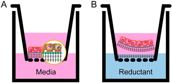 Illustration of the culture inserts and cell sheet detachment used for this study. (A): Cells were seeded in the culture insert until they reached the targeted thickness, which could largely vary according to the organ where the cell sheet was applied; (B): at the time of detachment, the culture medium inside the well was replaced by the reductant solution, which was used to cut the functional disulfide bonds between the bottom surface of the attached cell sheets and the inserts.