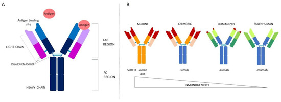 According to their origin and the dictation of the WHO [4], there are four types of mAbs: murine, chimeric, humanized, and human [5,6] (Figure 1B).