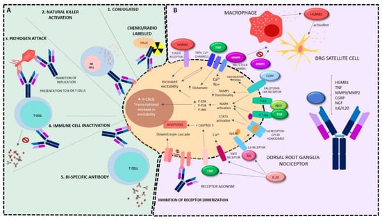 Figure 2. Mechanism of action of monoclonal antibodies. Potential targets of mAbs according to the mechanism of action and signaling cascade pathways modified by them. (A) Depicting their importance as (1) conjugated with radio or chemoligands for oncological treatments; (2) activators of natural killer cells; (3) antiviral agents, inhibiting viral proliferation or presenting pathogens to T or B cells; (4) immunosuppressors being tremendously relevant in autoimmune diseases; (5) dual role players as bi-specific antibodies binding two cells and generating response in them. (B) Focusing on the treatment of pain, aiming at the inhibition of nociceptive pathways. Clockwise, they may recognize HGMB preventing its biding to TLR2/4 receptors, and its release by macrophages and subsequent activation of other satellite cells. They may be designed to bind TNF, hence blocking the increased excitability of neurons it produces when it binds to TRPV and calcium channels, also preventing the phosphorylation of Trk-A and caspase 3-mediated apoptosis. Regarding stalling MMPs, a success as an inhibition of the opening of sodium channels may be attained, as well as the blocking of the activation of macrophages and other satellite cells MMPs are able to carry out. Targeting CGRP, the block of the activation of the calcitonin receptor may be obtained. Similarly, as with TNF, when designed to bind NGF, an inhibition of the phosphorylation of Trk-A is achieved. Interleukin 6 renders a dimerization of its receptor together with Gp130, which is blocked by the binding of mAbs designed for such purpose, as it occurs when they bind interleukin 20, where the inhibition of the entrance of calcium ions would take place. Ca: calcium; CGRP: calcitonin gene-related peptide; DRG: dorsal root ganglia; pERK: phosphorylated extracellular signal-regulated kinase; Gp130: glucoprotein 130; HGMB: high mobility box; IL: interleukin-6; IL20: interleukin-20; p-JNK: phosphorylated c-Jun N-terminal kinase; MAPK: mitogen-activated protein kinase; MMP: matrix metalloproteinase; Na: sodium; NGF: nerve growth factor; NK: natural killer; p-P38: phosphorylated protein p38; RAMP1: receptor activity-modifying protein 1; SOCE: store-operated calcium entry; STAT3: signal transducer and activator of transcription 3; TLR4: toll-like receptor- 4; TNF: tumor necrosis factor; Trk-A: tyrosine kinase A; p-Trk-a: phosphorilated tyrosine kinase; TRPV: transient receptor potential cation channel.