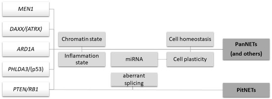 The identification of the pathways involved in NET development showed that, besides well-known pathways such as PTEN/mTOR, the most relevant or frequently altered genes have a role in histone modification and chromatin remodeling or telomere maintenance, e.g., MEN1, DAXX, ATRX, SETD2, ARID1A, and MLL3, with a variety of downstream effects on transcriptional regulation yet to be fully elucidated.