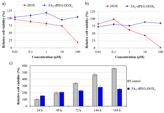 Results of the cytotoxicity assays. Relative cell viability of MDA-MB-231 cells vs. concentration of free DOX and FA2-dPEG-DOX2 after 24 h-long (a) and 48 h-long (b) treatment. Long-term effect of FA2-dPEG-DOX2 at 100 μM concentration on cell viability (c). All data were normalized to the viability value of untreated control measured 24 h after the beginning of the treatment.