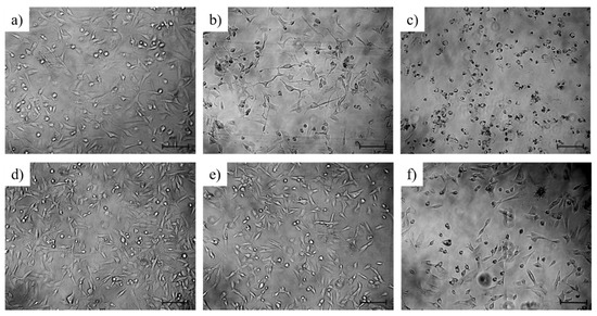 Phase-contrast microscopic morphology of MDA-MB-231 cells after 48 h-long treatment with free DOX (a–c) and FA2-dPEG-DOX2 (d–f) at concentrations of 0.01 μM (a,d), 1 μM (b,e), and 100 μM (c,f) regarding DOX. The scale bars indicate 100 μm.