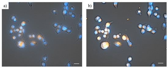 MDA-MB-231 cells 5 min (a) and 30 min (b) after the beginning of the treatment with FA2-dPEG-DOX2 at 16 μM concentration (regarding FA). The blue color shows the cell nuclei, while the orange color is the doxorubicin. The scale bars indicate 25 μM. The images were taken by the Zeiss Celldiscoverer 7 automated platform.
