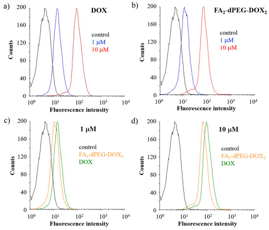 Flow cytometric measurement of doxorubicin uptake into triple-negative human breast cancer cell line (MDA-MB-231) cells. Concentration-dependent uptake of free doxorubicin (a) and the conjugated doxorubicin (b) (black line: untreated control; blue line: 1 µM; red line: 10 µM). Comparison of DOX and FA2-PEG-DOX2 internalization with representative figures regarding the uptake of free doxorubicin and the conjugated drug at a concentration of 1 µM (c) and 10 µM (d) (black line: untreated control; orange line: FA2-dPEG-DOX2; green line: free doxorubicin).