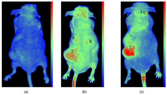 In vivo fluorescent images from the dorsal view of FoxnNu/Nu nude mice bearing LNCaP prostate xenograft tumors. Images before (a) and 24 h after IV (b) in one mouse, and after 24 h after intratumoral injection in another mouse (c). All images are standardized to identical light radiance minima and maxima in relative light intensity per pixel arbitrary units to allow for direct comparison. Fluorescence of the PDC is identified in the tumor (T) tail vein, kidneys (K), and capillary-rich head nuchal skin in (b), while a distinct fluorescent signal is observed in the tumor (T) and some lymph nodes of the neck (Ln) in the case of intratumoral PDC injected animal (c). The slight autofluorescence, as seen in (a) before injection, is clearly different from the fluorescent signals of injected animals.