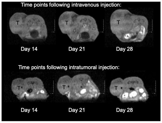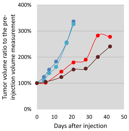 The increase in the tumor volumes was slowed down until Day 21. After this time point, the intravenously injected mouse tumor grew in a faster manner than the tumor of the intratumorally injected animal (Figure 8.). Throughout the study, the intratumoral injection seemed to delay tumor growth more than the intravenous route of delivery. The mouse health status, food, water consumption, and behavior remained unchanged during the observation.