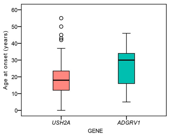 There was no significant difference between the age at disease onset between ADGRV1 (median 30 years, range 5–46 years) and USH2A patients (18 years, range 0–55 years) (Mann–Whitney U test, p = 0.13) (Figure 1).