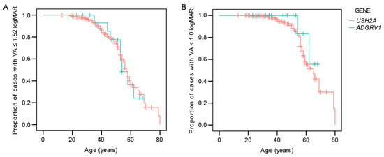 Table 1 shows the frequency of legal blindness in the better eye for each genotype. The multiple regression analysis showed a significant association between visual acuity in the better eye and age (p < 0.001) but not genotype (p = 0.3). The Kaplan–Meier survival analysis predicted that the mean age when 50% of the patients reached legal blindness based on visual acuity of 0.1 or less (1.0 logMAR or more) was 64 years for USH2A (95% CI 61–68 years) and 64 years for ADGRV1 (95% CI 60–68 years) (Figure 2). The difference was not significant (log-rank, p = 0.3). The median value was 65 years for USH2A but could not be determined for ADGRV1 due to the fact that all of the patients were censored prior (i.e., all had BCVA > 0.1 at the last follow-up). The median age when 50% of the patients were predicted to reach visual acuity <0.3 (>0.52) on the better eye was 57 and 54 years for USH2A and ADGRV1, respectively. The difference was not significant (log-ank, p = 0.9).