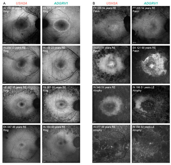Representative FAF images of USH2A and ADGRV1 patients. (A). hyperautofluorescent rings with preserved central retina. (B). advanced disease—hyperautofluorescent patch and atrophy. The patient’s ID, age and FAF pattern is stated in the top left corner of each image. The affected gene is stated above each column. Note that almost identical patterns were found in both groups. Red color represents USH2A patients and green color represents ADGRV1 patients.