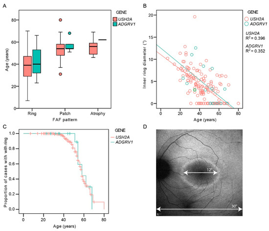 (A). Boxplot showing ages of patients with different autofluorescence patterns. (B). The diameter of the hyperautofluorescent ring in relation to age and genotype. (C). Kaplan–Meier survival analysis showing the proportion of cases with FAF pattern of hyperautofluorescent ring (preserved central retina) with increasing age. (D). Demonstration of the measurement of the inner ring diameter. Note the similarity between the survival curves representing the structural (C) and functional decline (Figure 2). Red color represents USH2A patients and green color represents ADGRV1 patients.