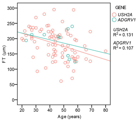 CME was present in 26% (35/135) of USH2A and 31% (5/16) of ADGRV1 patients with no statistical difference in frequency between the two groups (Fisher’s Exact Test, p = 0.4). Table 3 shows the number of patients with different degrees of CME. Considering all of the patients, CME was significantly more frequent in patients with a hyperautofluorescent ring pattern (34%, 30/87) than those with patch or atrophy (12%, 5/42) (Fisher’s Exact Test, p < 0.01). An analysis of foveal thickness (FT) with respect to age and genotype was performed on the largest group of patients imaged with the same OCT machine (Spectralis Heidelberg) to avoid measurement differences [13]. The patients with CME were excluded, leaving 83 USH2A and 10 ADGRV1 patients. Multiple regression analysis showed a significant correlation between FT and age (p < 0.001), with FT decreasing with age, but no correlation with gene (p = 0.6) (Figure 5).