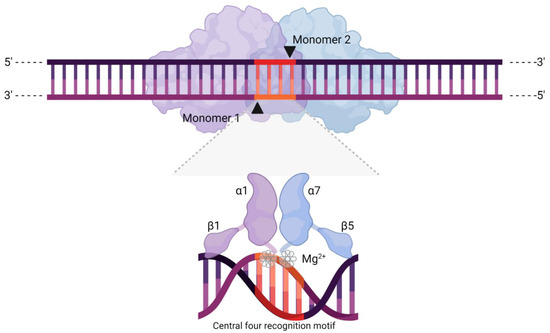 Schematic representation of a meganuclease (MN), depicting its two characteristic ɑββɑββɑ domains, shown here as monomers of different colour. The arrows indicate the cleavage sites, resulting in a DSB with 4-nt 3′ overhangs. The highlighted section represents the central four recognition motif, shown at the bottom in close proximity to the MN active site. This set of four bases lies at the centre of the broader DNA recognition sequence and directly determines cleaving activity and specificity through a cofactor displacement mechanism. Effectively, mismatches in this motif produce structural rearrangements that displace metallic ions (Mg2+) from the active sites.