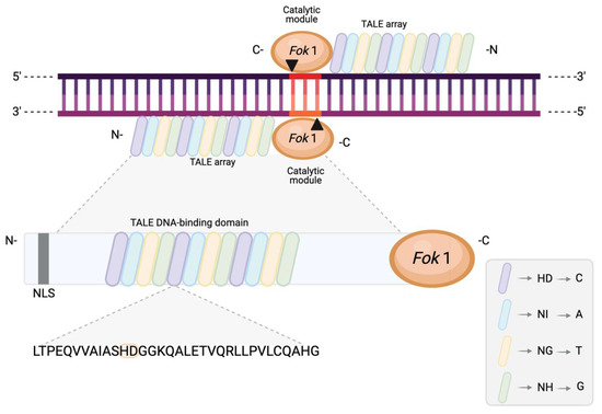Transcription activator-like effector nucleases (TALENs) are artificial restriction enzymes that combine the catalytic module of FokI nucleases with the DNA-binding domain of TALEs (Figure 4). TALEs are naturally occurring virulence proteins secreted by plant pathogenic Xanthomonas bacteria [40] which bind to specific DNA sequences via a central DNA-binding domain to activate the expression of a host gene. This central domain identifies a target sequence and uses a distinct type of DNA-binding mechanism based on one-to-one correspondence between an individual repeat and a single base. This is made possible by the composition of the domain, which features 15–19 highly similar tandem repeats assembled as an array, with each repeat comprising 33–35 amino acid motifs. The repeat closest to the C-terminus contains only 20 amino acids and is called a “half”-repeat [57].