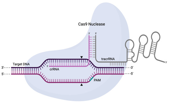 Schematic representation of a Cas9 nuclease in complex with crRNA, tracrRNA, and a target sequence. The crRNA will directly guide the recognition of the target sequence and form a heteroduplex with it while the tracrRNA serves as a structural interface with the nuclease. The highlighted region represents the protospacer adjacent motif (PAM), which is required for sequence recognition and cleavage. The arrows indicate the two separate cuts resulting in a blunt-ended DSB.
