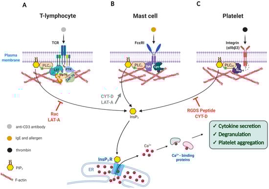 Modulation of the Ca2+ signal transduction by the actin cytoskeleton in the cells of immune response. Artificially altered actin dynamics during cell activation either enhances or represses Ca2+ signaling through the PLC/InsP3 pathway. (A) Exposure of T-lymphocytes to anti-CD3 antibody triggers T-Cell Receptor activation that leads to a cascade of downstream phosphorylation reactions that activates enzymes like PLC-γ1, ZAP-70 (Zeta-chain-associated protein kinase 70), PTKs as well as adaptor proteins such as LAT, Slp76, and Gads. Interference with the actin dynamics by use of Rac overexpression or Latrunculin-A (LAT-A) reduces phosphorylation of these enzymes, and thereby inhibits the PLC-γ1 activity and cytokine secretion. (B) Upon binding to antigen-IgE, the FcεRI receptor on the surface of a mast cell is phosphorylated and recruits more Lyn kinase to activate Syk kinase, which in turn stimulates PLC-γ to produce InsP3 and thereby release intracellular Ca2+ and trigger degranulation. If the concomitantly occurring actin polymerization is prevented by actin drugs LAT-A or Cytochalasin-D (CYT-D), the activation of PLCγ is even more enhanced. (C) Binding of thrombin to the integrin receptor (αIIbβ3) on the plasma membrane leads to enhanced polymerization of actin, which is accompanied by the translocation of PLCβ3 and other proteins. The resulting Ca2+ signal induces platelet aggregation. When the responsive actin polymerization is inhibited by CYT-D or fibrinogen antagonist tetra-peptide (RGDS), the extent of PLCγ activation and platelet aggregation is severely compromised. Note: The T-shaped red bars near the curved arrows denote inhibition.