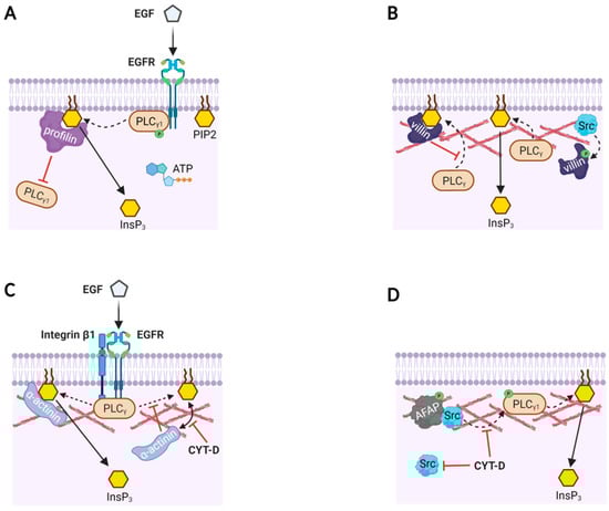 If the actin cytoskeleton modulates signal transduction in the subplasmalemmal region, ABPs may well play crucial roles behind the scenes. As its name implies, ABP binds to actin monomer (G-actin) or F-actin and influences the polymerization dynamics to remodel the actin cytoskeleton, often in an accelerated manner. Importantly, most ABPs have a stretch of basic amino acid residues that are thought to enable ABPs to anchor to PIP2 on the inner leaflet of the plasma membrane [13]. Their competitive binding to both actin and PIP2, or even directly to enzymes, would have a profound impact not only on the actin cytoskeleton dynamics, but also on signal transmission [87,88]. According to an in vitro study with purified proteins and synthetic membranes, when profilin (an actin monomer-sequestering protein) is bound to PIP2, it prevents PIP2 from being cleaved by non-phosphorylated quiescent PLC-γ1. However, upon activation of EGFR and the subsequent tyrosine phosphorylation of PLC-γ1, the inhibitory binding of profilin to PIP2 is overcome by the phosphorylated PLC-γ1, and PIP2 is cleaved (Figure 2A). Profilin binding to PIP2 not only inhibits its own interaction with actin [70,89], but may also prevent non-phosphorylated PLC-γ1 from binding its substrate PIP2 and thereby impede the formation of the second messengers InsP3 and DAG. Thus, binding or displacement of profilin on PIP2 may be a critical factor controlling the activity of certain enzymes that interact with PIP2 [89]. In this case, what influences the enzyme activity of PLC-γ1 is not the actin filaments per se, but the accessary protein that binds to actin.