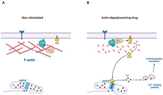 - Vasilev, F.; Limatola, N.; Park, D.-R.; Kim, U.-H.; Santella, L.; Chun, J.T. Disassembly of Subplasmalemmal Actin Filaments Induces Cytosolic Ca2+ Increases in Astropecten aranciacus Eggs. Cell. Physiol. Biochem. 2018, 48, 2011–2034. [Google Scholar] [CrossRef]