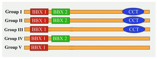In plants, based on the distance between the zinc-binding residues and their consensus sequence, the BBX domains can be divided into the B-box1 (B1) and B-box2 (B2) classes [4]. The CCT domain, which is highly conserved and composed of 42 or 43 amino acids, is important for nuclear protein transport and the regulation of transcription [5,6]. The BBX domain is predicted to include conserved histidine (H), cysteine (C), and aspartic acid (D) residues that modulate protein–protein interactions [4,7,8]. Khanna et al. identified 32 BBX genes in Arabidopsis thaliana and named them AtBBX1–32 [4]. These 32 BBX genes were further classified into Groups I–V depending on the number of BBX and CCT domains [3,4,9] (Figure 1). In A. thaliana, CONSTANS (CO)/AtBBX1, which was the first member of the BBX family to be studied, is the main coordinator of flowering time because it induces FLOWERING LOCUS T (FT) expression [9,10].