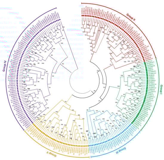 To elucidate the evolutionary relationships and functional divergence among Brassica BBX proteins, the sequences of 51 B. rapa BBX proteins, 52 B. oleracea BBX proteins, 101 B. napus BBX proteins, and 32 A. thaliana BBX proteins were used to construct an unrooted phylogenetic tree (Figure 2). The BBX proteins were divided into five groups (Groups I–V) according to previous studies [3,4]. The Group I BBXs contained B1 and B2 domains along with the CCT domain; the Group II BBXs had the same domains as the Group I proteins, but the B2 domain differed at the amino acid level; the Group III BBXs included the B1 domain and the CCT domain; the Group IV BBXs had B1 and B2 domains, but lacked the CCT domain; and the Group V BBXs only had a single B1 domain. Groups I and IV had the most BBX members (Figure 2). Some of the BBXs were not categorized as expected. For example, BrBBX5, BrBBX48, BoBBX4, and BoBBX45 included only the B1 domain and the CCT domain, suggesting they should belong to Group III, but they were in Group II in the phylogenetic tree; likewise, BrBBX16 and BnCBBX96 should be in Group V as they included only the B1 domain, but they fall in Group IV and II, respectively (Figure 2).