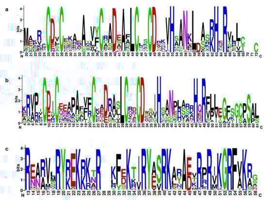 Web logos of BrBBX proteins. (a–c) Alignments of the B-box1, B-box2, and CCT domains, respectively. The x-axis indicates the conserved domain sequences. The height of each letter indicates how conserved the residue is across all proteins. The y-axis presents the relative entropy, which reflects the conservation rate of each amino acid.