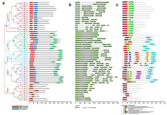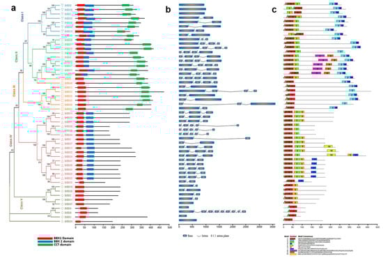 Brassica oleracea B-box gene structures (a), motifs (b), and conserved domains (c). The domain architecture of the B-box genes is presented in panel a. Exons are represented by colored boxes, whereas introns are indicated by gray lines (b). Colored boxes indicate conserved motifs and gray lines represent non-conserved sequences. The motif lengths in each protein are presented proportionally. Classes I–V represent different groups of B-box family members in B. oleracea.