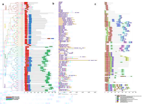Brassica rapa B-box gene structures (a), motifs (b), and conserved domains (c). The domain architecture of the B-box genes is presented in panel a. Exons are represented by colored boxes, whereas introns are indicated by gray lines (b). Colored boxes indicate conserved motifs and gray lines represent non-conserved sequences. The motif lengths in each protein are presented proportionally. Classes I–V represent different groups of B-box family members in B. rapa.