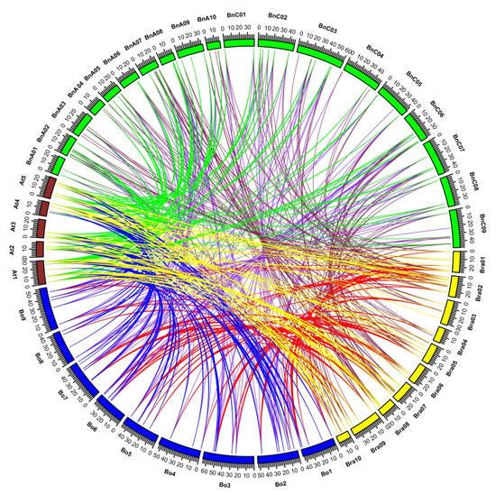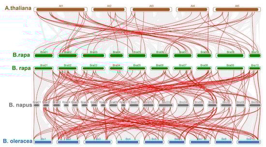 In addition to identifying gene duplication events, we investigated the synteny between the BBX gene families of A. thaliana, B. rapa, B. oleracea, and B. napus. A total of 43 chromosomes (5, 10, 9, and 19 from A. thaliana, B. rapa, B. oleracea, and B. napus, respectively) and 236 BBX genes (32, 51, 52, and 101 from A. thaliana, B. rapa, B. oleracea, and B. napus, respectively) were used to investigate syntenic relationships. Orthologous BBX genes and genes resulting from segmental duplications are indicated by different colored lines in Figure 7. The BrBBX genes on chromosomes 1 (BrA01), 2 (BrA02), and 10 (BrA10) had orthologs on chromosomes AT1, AT3, AT4, and AT5 (A. thaliana), C01, C02, and C09 (B. oleracea), and A01, A02, A08, A09, A10, C01, C02, C06, C08, and C09 (B. napus). A total of 235 BBX gene pairs (Tables S8–S13) had syntenic relationships between A. thaliana and B. rapa, B. oleracea, and B. napus. Additionally, 58 orthologous pairs were detected between A. thaliana and B. rapa as well as between A. thaliana and B. oleracea, which was fewer than the 68 orthologous pairs detected between A. thaliana and B. napus. Fifty-six orthologous pairs were identified between B. rapa and B. oleracea as well as 121 orthologous pairs between B. rapa and B. napus and 123 orthologous pairs between B. oleracea and B. napus (Tables S8–S13).