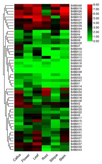 We investigated the expression patterns of 51 BrBBX genes in different organs and during various developmental stages using available transcriptome data [51]. Gene expression was analyzed in the callus, flower, leaf, root, silique, and stem. The expression levels varied among genes, with some genes exhibiting tissue-specific expression (Figure 9). These results suggest that BBXs in B. rapa may affect diverse biological processes in different tissues. Of the 51 BrBBX genes, 12 (BrBBX19, BrBBX21, BrBBX25, BrBBX29, BrBBX6, BrBBX35, BrBBX39, BrBBX41, BrBBX44, BrBBX45, BrBBX46, and BrBBX51) were relatively highly expressed in all developmental stages and tissues, reflecting their overall involvement in B. rapa plant development. Some BBX genes (BrBBX5, BrBBX16, BrBBX40, BrBBX48, and BrBBX51) were expressed at very low levels in all organs in different growth stages. Additionally, BrBBX27, BrBBX32, and BrBBX37 were expressed at higher levels in the silique than in the stem, flower, leaf, and root (Figure 9).
