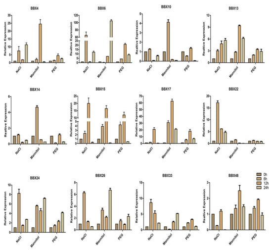 Abiotic stress-induced BrBBX expression profiles. The graphs present the expression levels in Brassica plants following NaCl, mannitol, and PEG treatments. Samples were collected at various time points for a qRT-PCR analysis. The x-axis presents the abiotic stresses. The y-axis presents the relative expression levels. Error bars indicate the standard deviations of three independent qRT-PCR biological replicates.