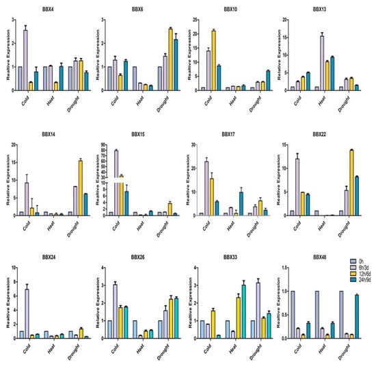 Inducible expression profiles of Brassica BBX genes in response to cold, heat, and drought conditions. The x-axis presents the treatments. The y-axis presents the expression levels relative to the expression at the 0-h time point. Error bars indicate the standard deviations of three independent qRT-PCR biological replicates.