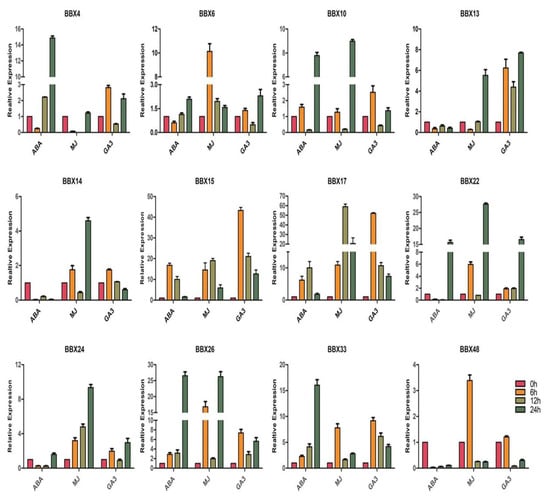 We observed that BrBBX10, BrBBX22, BrBBX26, and BrBBX33 were highly expressed at some time points following the ABA, MeJA, and GA3 treatments (Figure 12). The BrBBX14, BrBBX24, and BrBBX48 expression levels were upregulated by the application of exogenous MeJA, but were relatively unaffected by ABA and GA3. Interestingly, among the 12 selected BrBBX genes, only BrBBX4 was expressed at very low levels after the exogenous MeJA treatment. Regarding the effects of the exogenous ABA treatment, BrBBX15, BrBBX17, BrBBX26, and BrBBX33 expression levels were upregulated (minimum 0.5-fold increase) at all time points. Moreover, BrBBX6, BrBBX15, BrBBX17, BrBBX24, and BrBBX26 were also highly expressed at all time points after the MeJA treatment. For both ABA and MeJA, the BrBBX genes were most highly expressed at the 24-h time point. Regarding the effects of GA3, BrBBX13, BrBBX15, BrBBX17, BrBBX22, BrBBX26, and BrBBX33 expression levels were upregulated at almost all time points, but especially at 6 h post-treatment (Figure 12).
