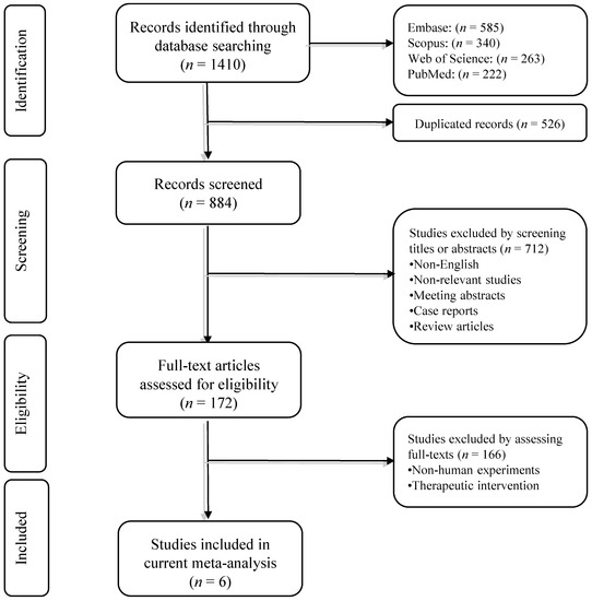 Our systematic search retrieved 1410 records. After removing duplicated studies, 884 records remained. Based on screening the title/abstract of the records, 712 papers did not meet the aforementioned inclusion criteria. In phase II, the full text of the remaining 172 studies and their supplementary data were reviewed. Finally, six studies met the abovementioned criteria and were included in the quantitative synthesis. The flowchart of literature inclusion and exclusion is shown in Figure 1.