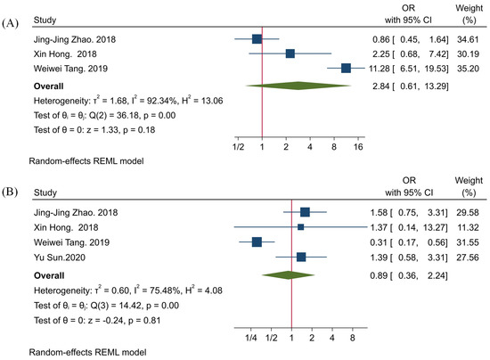 Forest plots for evaluating the association between TIGIT expression and clinicopathological characteristics of affected patients. (A) tumor size, and (B) tumor differentiation.