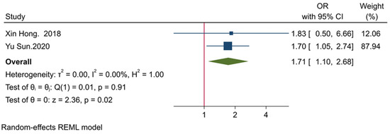 Our study has demonstrated that there is a significant association between the expression of TIGIT and PD-1 (OR = 1.71, 95% CI: 1.10–2.68, and p-value = 0.02) (Figure 3). Besides, our results have indicated that there is no significant heterogeneity among the included studies (p-value = 0.91, I2 = 0.00%, and H2 = 1.00) (Figure 3).