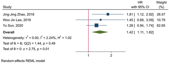 Our results have shown that increased TIGIT expression is significantly associated with the inferior OS of affected patients (HR = 1.42, 95% CI: 1.11–1.82, and p-value = 0.01) (Figure 4). Also, our results have indicated that there is no significant heterogeneity among the included studies (p-value = 0.49, I2 = 2.24%, and H2 = 1.02) (Figure 4).